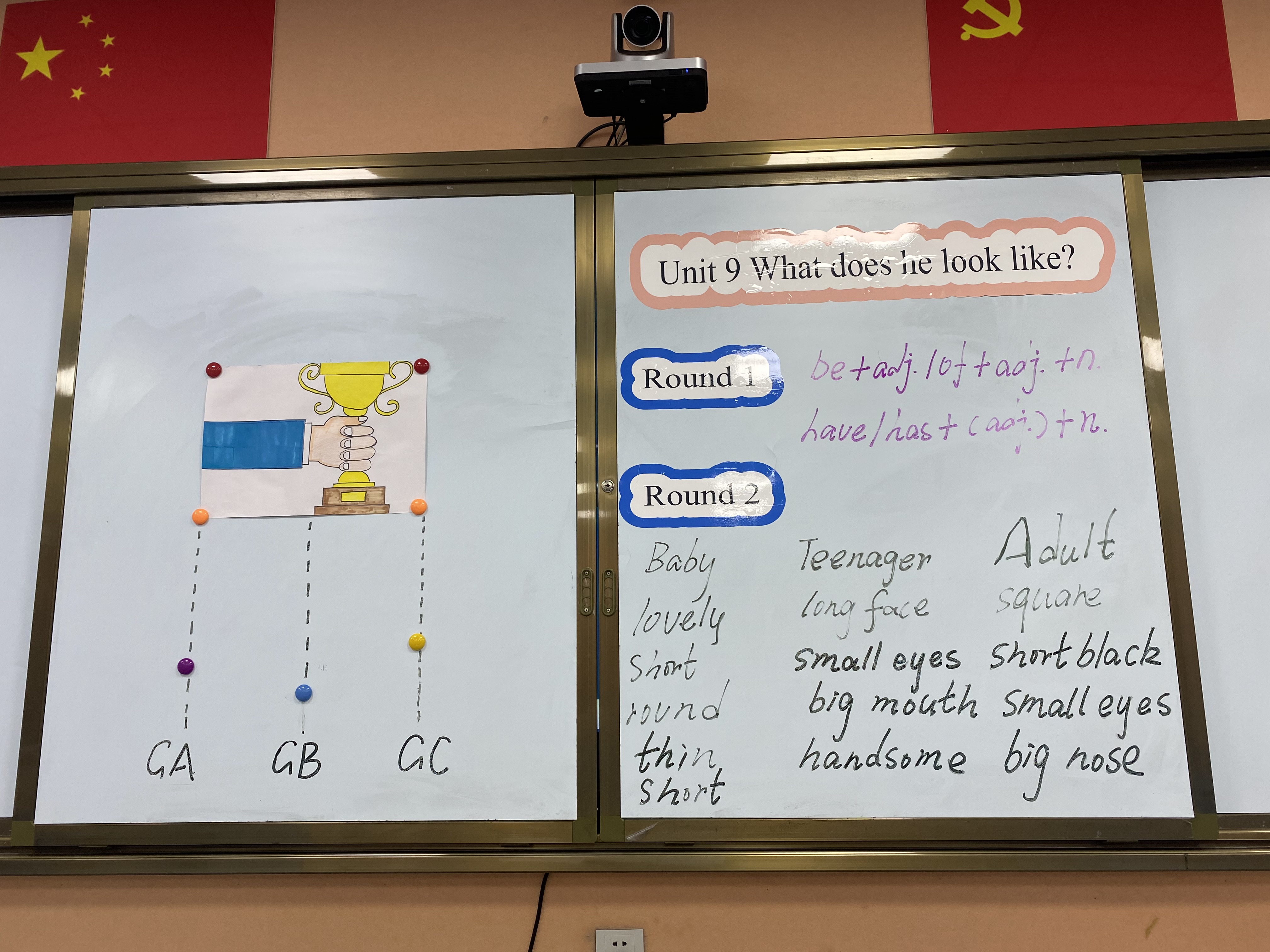 T: Today we are going to study Unit 9 What does he look like? This class I want to introduce my idol to you. Do you want to know who he is?